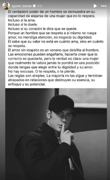 A través de sus historias de Instagram, L-Gante sorprendió con una publicación que no tardó en apuntar contra la mediática. “El verdadero poder de un hombre se demuestra en su capacidad de alejarse de una mujer que no lo respeta. Incluso si la ama. Incluso si le duele. Incluso si su corazón le dice que se quede”, comenzó escribiendo.